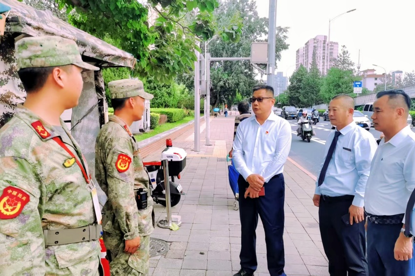 胡总一行先后前往看护桥民兵驻守点、长安街沿线等关键场所。每到一处,均与重点单位负责人围绕“安保方案细化、警保联勤联动机制、人员值守安排”展开深度交流,详细询问当前安保工作的难点与需求。检查环节中,重点核查了岗哨设置、装备配备以及安全防范措施的落实情况,并与重点单位保安员们进行了深入交流,了解他们在执勤过程中遇到的问题和困难。公司领导对保安兄弟们坚守岗位、认真履职的精神给予了高度评价,同时也鼓励大家要继续保持高度的责任感和使命感,严格按照各级公安机关安保工作要求,认真履行职责,为“庆祝活动”的顺利举行提供坚实的安全保障。