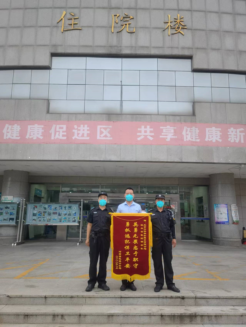 后经公安机关核查,该犯罪嫌疑人名叫崔某豪,盗窃犯,为网上在逃人员,长期以医院为目标实施盗窃行为。胡永强等4名保安队员不惧艰险,勇战犯罪人员的行为得到了丰台公安分局丰台镇派出所和河南范县公安局的高度表扬和认可,并各赠送锦旗一面,为保卫丰台医院一方平安做出了新的贡献。