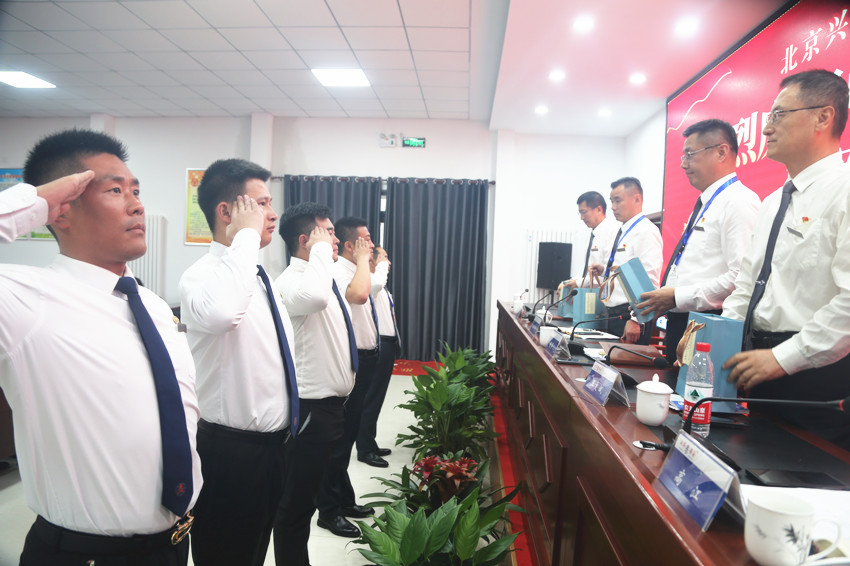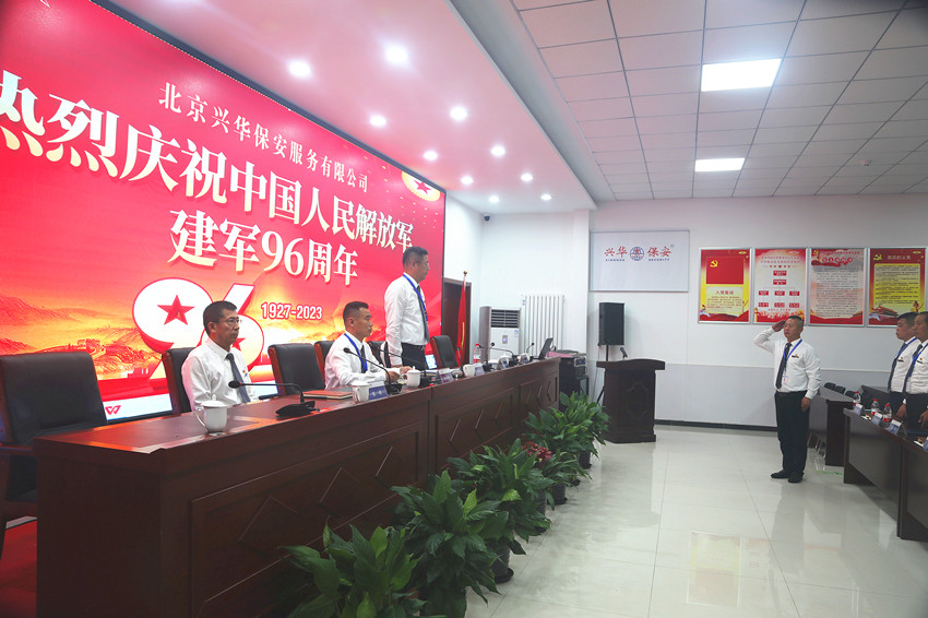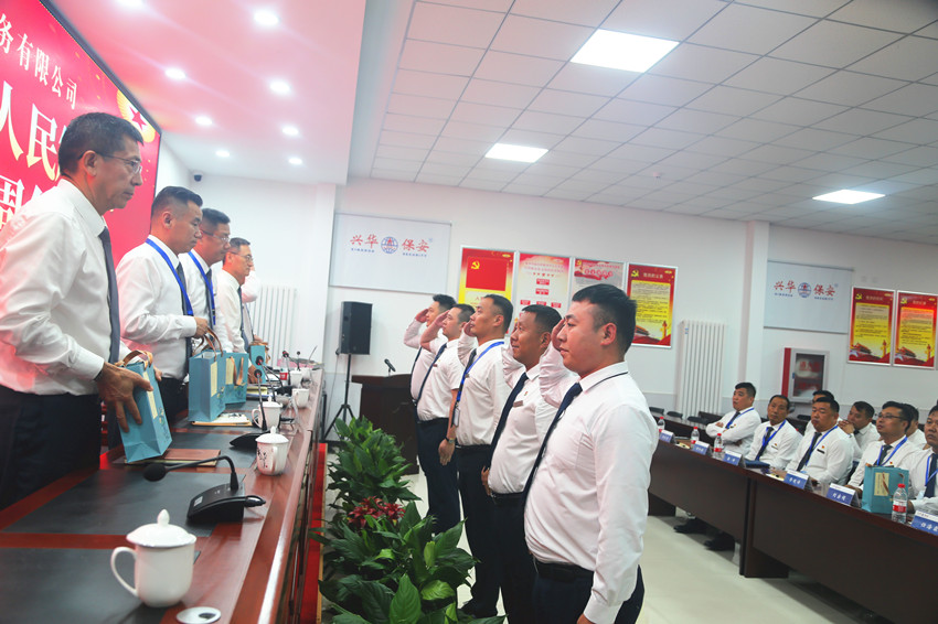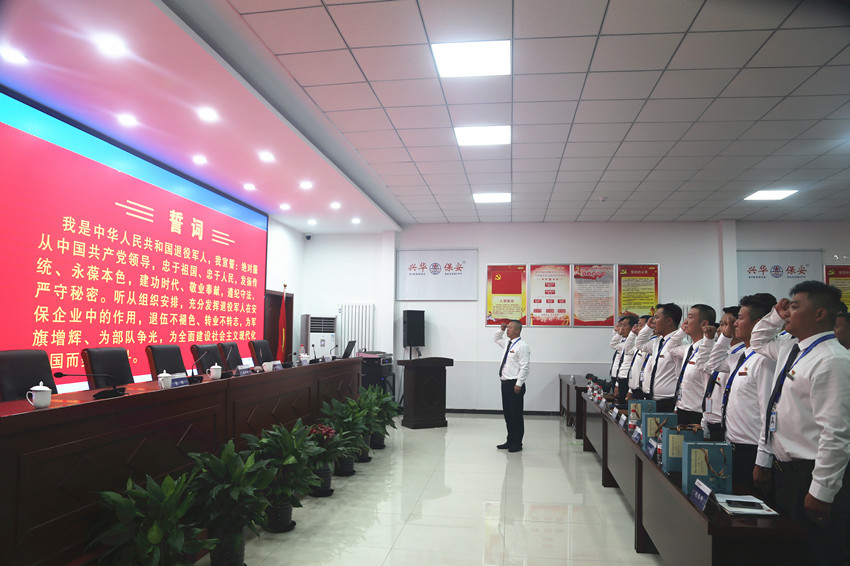 会上,党支部副书记高江带领全体退役军人向军旗庄严宣誓:“绝对服从中国共产党领导,忠于祖国、忠于人民,发扬传统、永葆本色.....”。两名退役军人分别代表驻场经理和运营经理做交流发言,从不同角度讲述了他们的参军入伍的往事和在兴华保安这个大家庭工作生活的感悟。